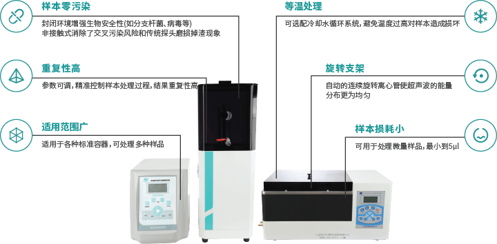 非接觸式超聲波粉碎機也叫杯式超聲破碎儀,可在密閉容器、無菌、可超微量條件下進行破碎。相比傳統的探頭超聲波細胞粉碎機,該儀器具有一次可同時檢測多個樣品、實驗效率高、無需頻繁操作探頭、避免樣本交叉污染等優勢。且該儀器可選配低溫恒溫裝置,便于樣品在4-10℃環境內工作,使能量分布均勻,超聲作用完全。逐漸成為ChIP(染色質免疫共沉淀)和DNA剪切研究平臺不可缺少的標準化工具。